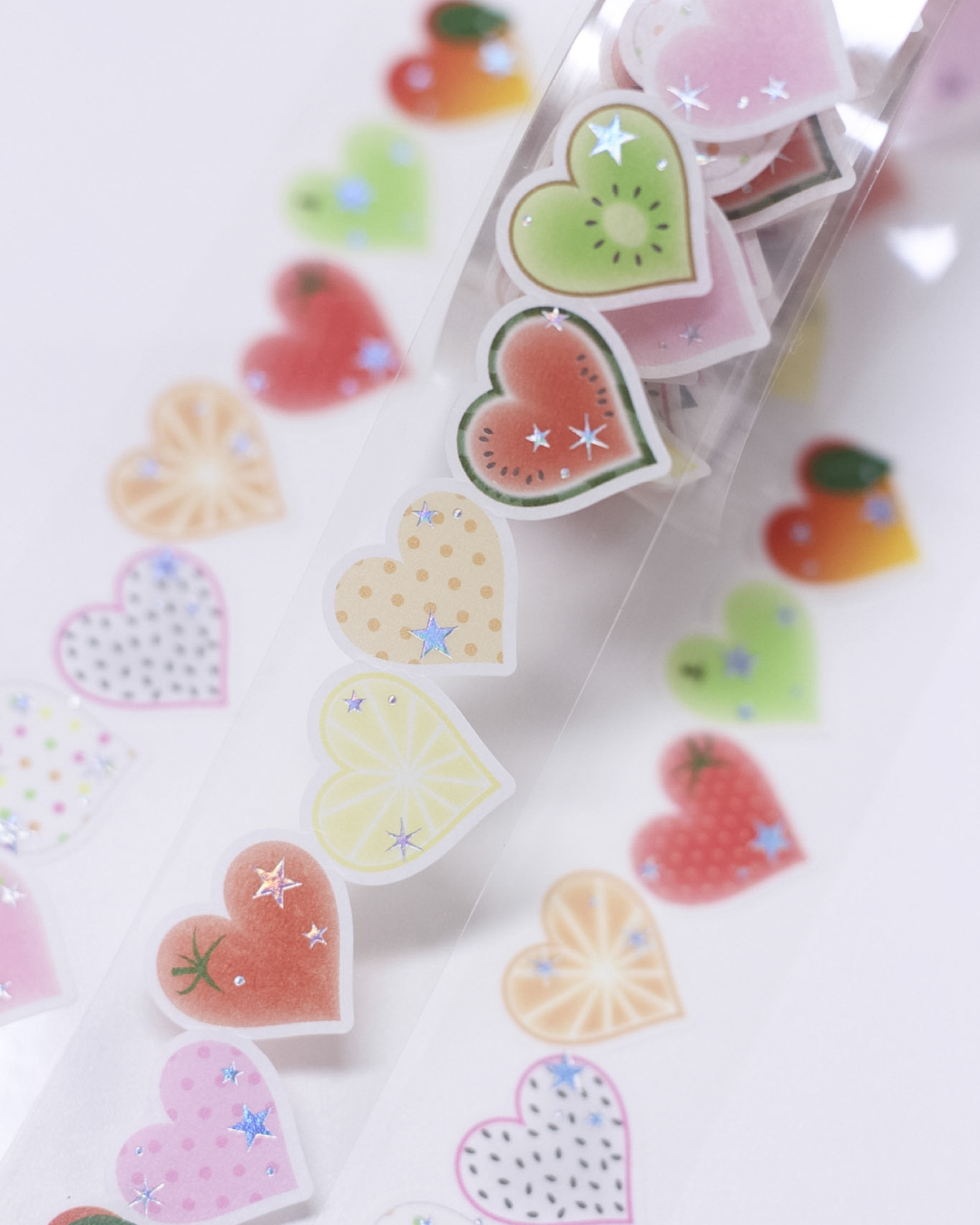 하트 모양 안에 과일을 담은 디자인의 다이컷 마스킹 테이프입니다.