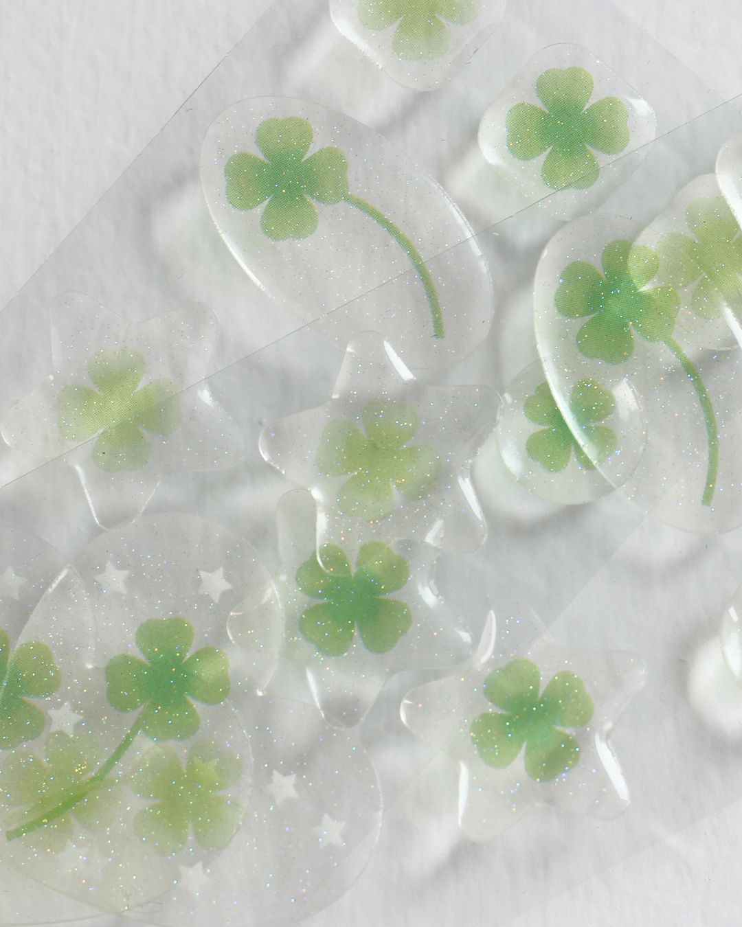 얼음 틀에 얼린 클로버를 표현한 글리터 에폭시 스티커입니다.