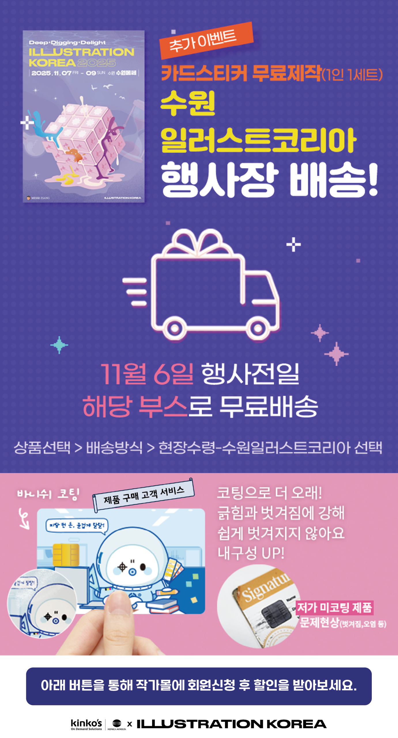 이번 수원 일러스트코리아에서 파트너사 킨코스코리아와 함께 최저가 굿즈 가격 제공, 부스까지 무료 배송 + 카드스티커 제작 서비스를 제공하고 있습니다. |