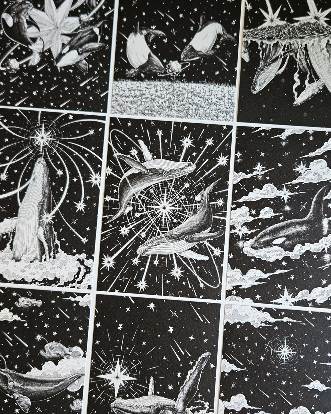 흑백으로 이루어진 세계 속 고래와 별들을 통해 잠시 현실에서 벗어난 몽환적인 상상을 담아냅니다.