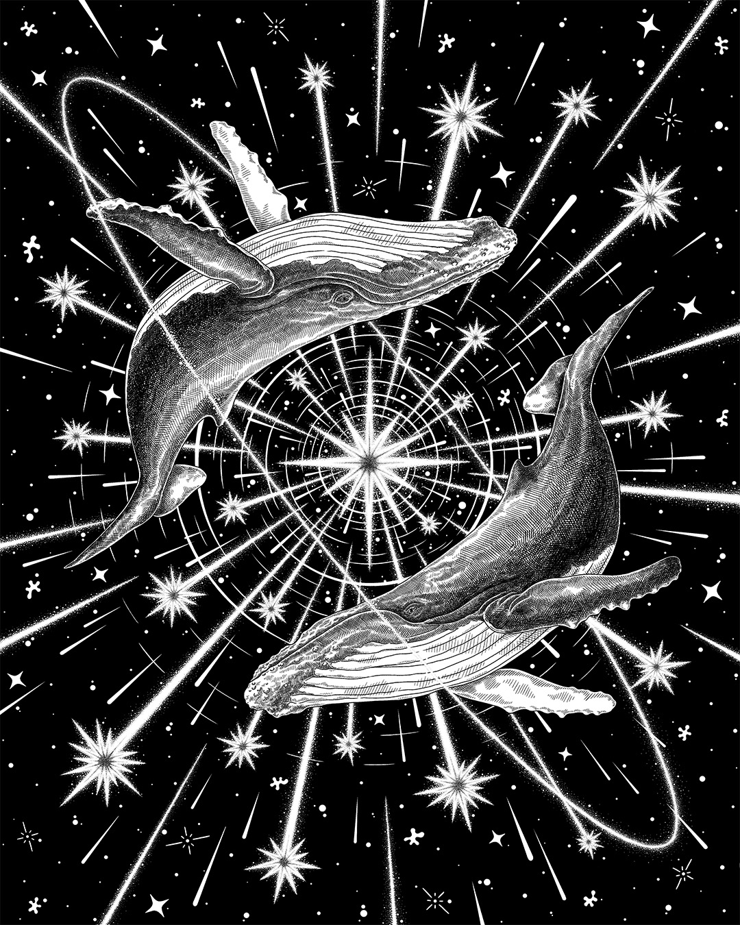 흑백 펜드로잉으로 우주를 헤엄치는 고래와 별을 그립니다.