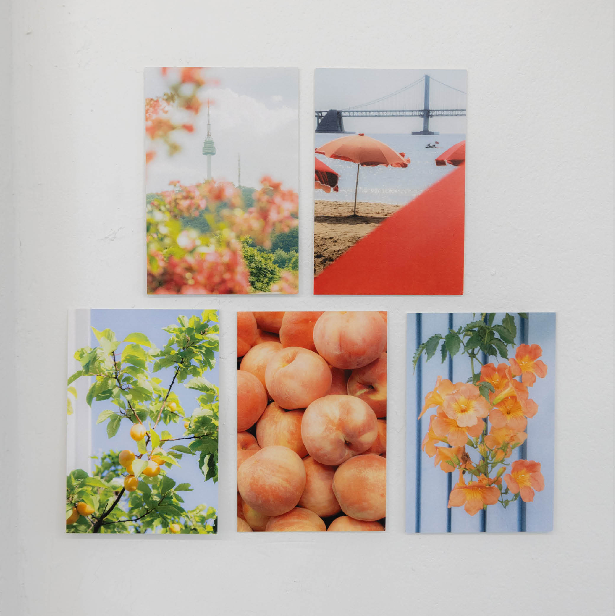 여름의 쨍한 느낌을 담은 엽서세트입니다. 복숭아, 배롱나무 그리고 능소화등 일상에서 만나는 코랄색감과 하늘색이 담긴 사진들을 세트로 구상했습니