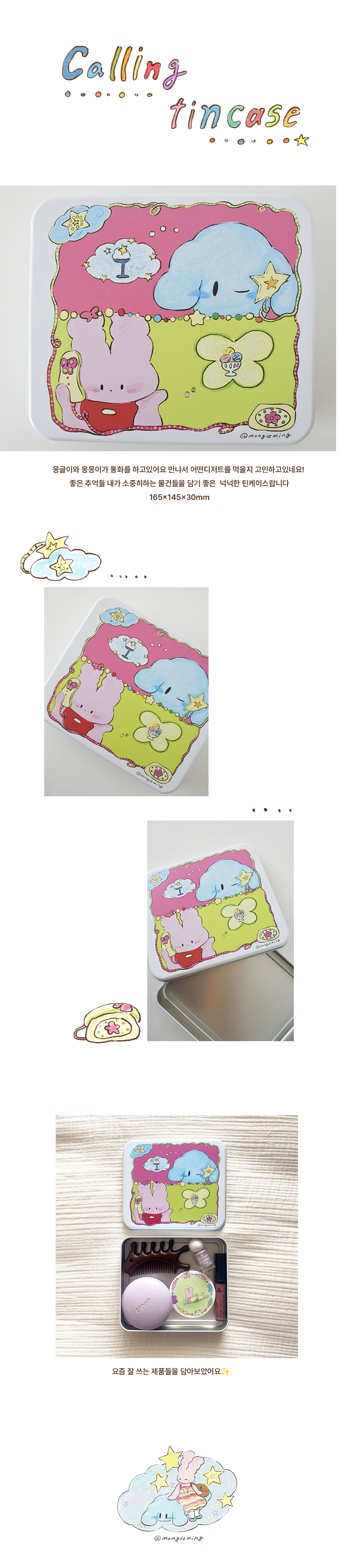 몽글이와 몽몽이의 틴케이스입니다 어떤 디저트를 먹을지 고민하고 있어요 주고받은 편지나 엽서 추억들을 담을수있는 빅틴케이스랍니다.